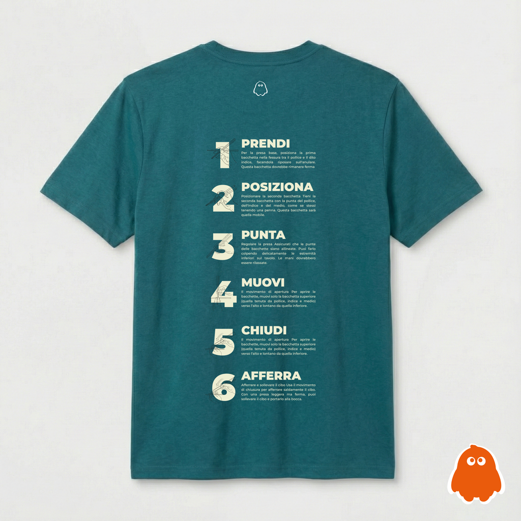 L'unica cosa che sai fare con le bacchette è suonare la batteria sul tavolo. Questa maglietta offre una guida passo-passo dettagliata e infallibile su come afferrare il cibo come un vero maestro orientale. Funziona? Probabilmente no. Ti farà sembrare più colto mentre cerchi di infilzare il raviolo a tradimento? Assolutamente sì. MAGI ti insegna a mangiare. O almeno ci prova.